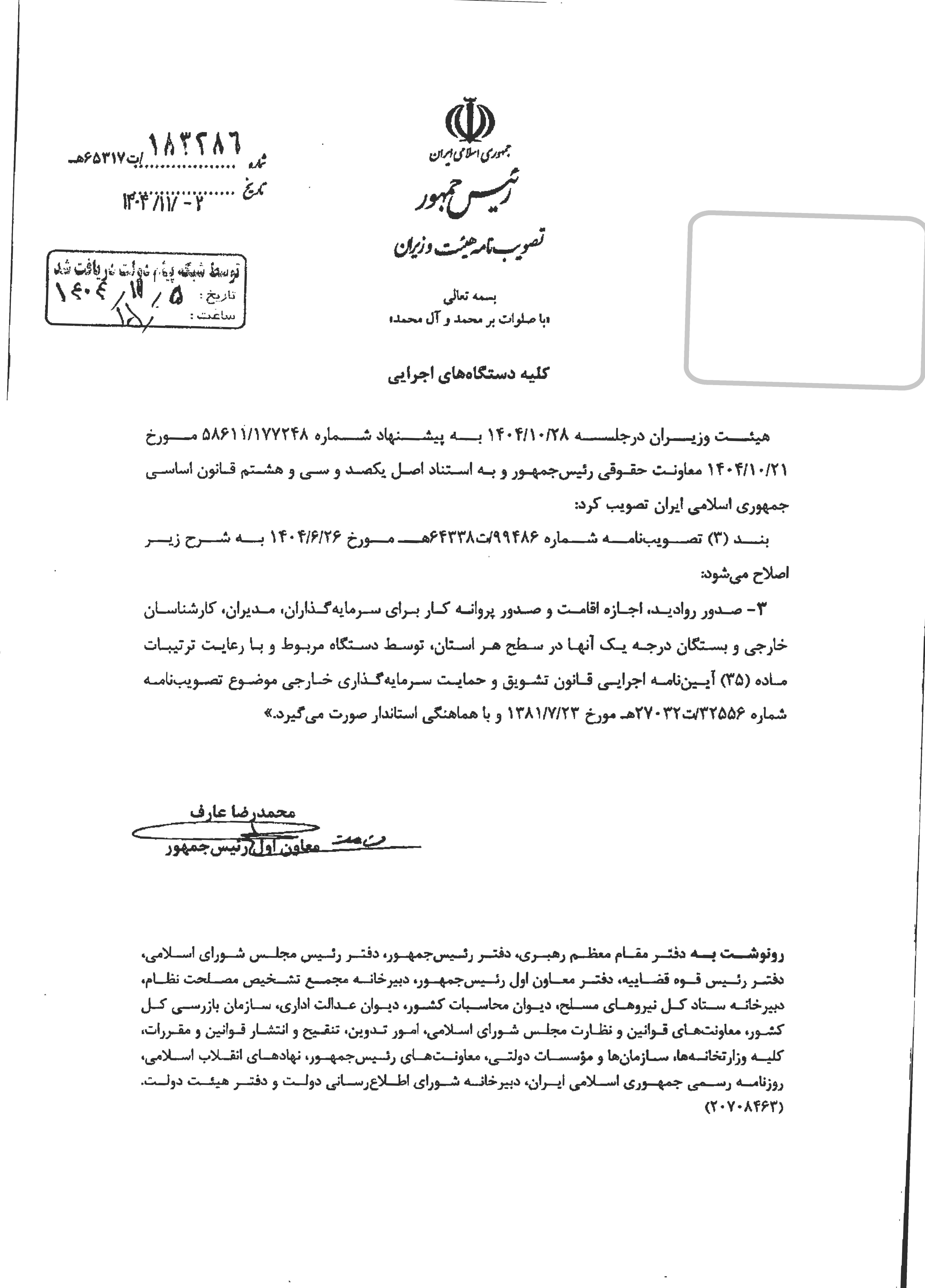 تصویب نامه هئیت وزیران - اصلاح بند 3 تصویب نامه شماره 99486 ت 64338 هـ مورخ 1404/06/26